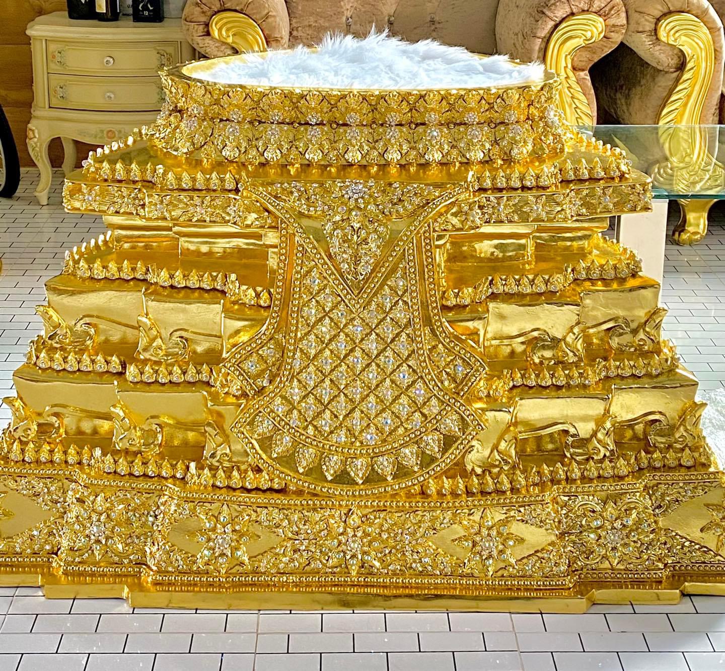 เครื่องทรง เราทำจากประเก็นหนัง ขึ้นลายด้วยดินโพลิเมอร์ เป็นงานทำมือ 100% ปิดด้วยทองแท้ 24k และประดับเพชรสวาล็อฟกี้